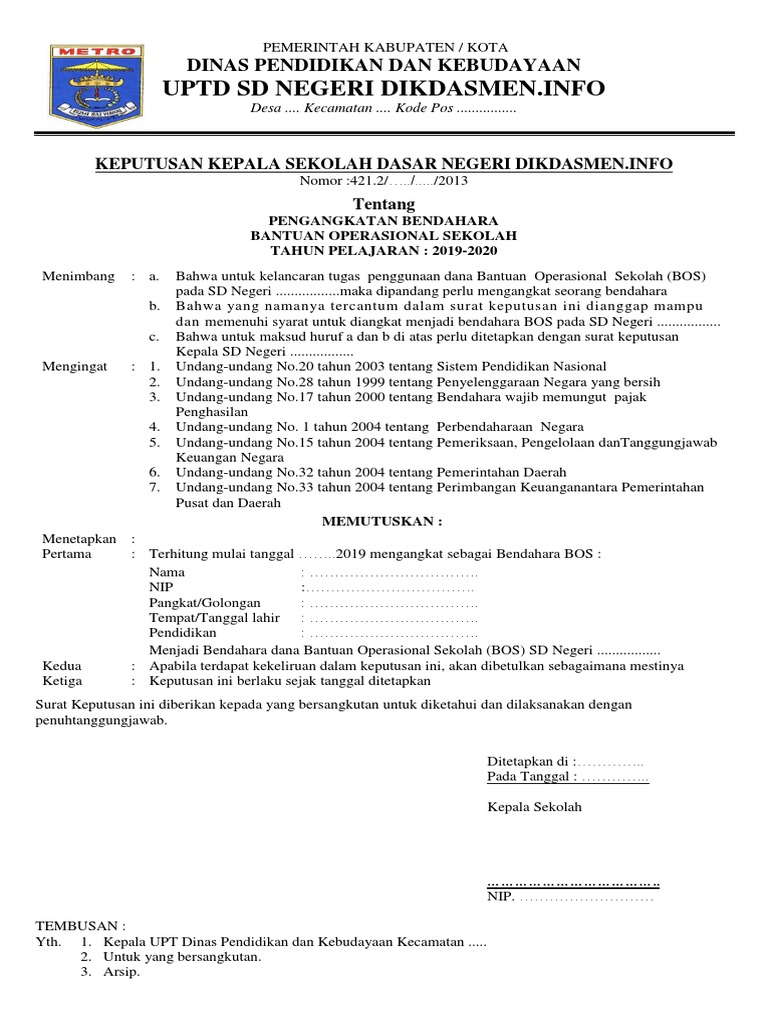 Keputusan kepala sd negeri patia 2 kecamatan patia nomor. Contoh surat keputusan bendahara bos picture submitted ang published by admin that preserved in our collection. Contoh surat tugas bendahara bos sd. Berikut ini adalah contoh dari sk penunjukkan guru di sekolah dasar yang diberi tugas tambahan. Contoh sk bendahara bos tahun 2019 2020 sd smp sma smk dikdasmen contoh surat sk bendahara sekolah contoh sk bendahara bos madrasah 2019.