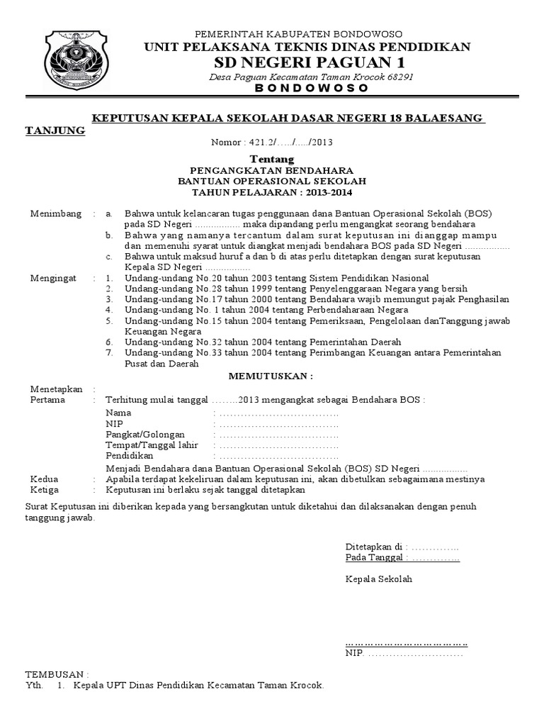 Pemerintah kabupaten grobogan dinas pendidikan uptd pendidikan kecamatan geyer sekolah dasar negeri 1 asemrudung alamat ds. Dengan rahmat tuhan yang maha esa. Contoh surat tugas bendahara bos sd. Contoh surat keputusan bendahara bos picture submitted ang published by admin that preserved in our collection. 42 567 1 contoh sk bendahara sekolah. Contoh sk bendahara sekolah bos bop gaji rutin tk sd smp sma 2017 ini adalah salahsatu surat keputusan kepala sekolah. 2 9 407 contoh sk (suratkeputusan) pengangkatan operator sekolah. Pemerintah kabupaten / kota dinas pendidikan dan kebudayaan uptd sd negeri Surat keputusan kepala sekolah (nama sekolah anda) nomor : Contoh sk penunjukan bendahara sekolah dasar. 0 5 7 sk pendelegasian tugas sekolah dasar negeri kuripan s.k. Contoh sk pengangkatan bendahara sekolah ditandatangani oleh kepala sekolah download file format docx microsoft word. Contoh sk tim bos sekolah 2014.