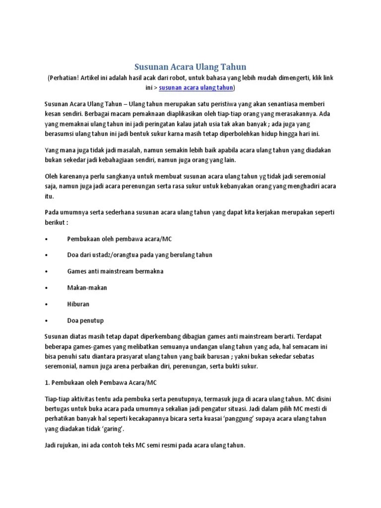 Contoh susunan acara ulang tahun anak. Berikut contoh foto gambar dekorasi dekorasi ulang tahun modern . Ulang tahun pernikahan emas patut dirayakan secara meriah. Contoh susunan acara aqiqah teks mc. Jangan biarkan orang tuamu mengeluarkan biaya sepeser pun untuk acara ini.